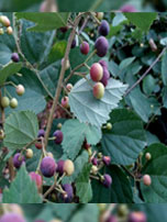 Fruits – round, large, pea shaped, green when raw and pungent, brown when unripe. On ripening, they become violet and swee
