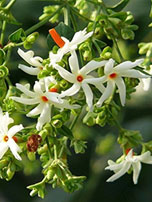 Night Blooming Jasmine is a sprawling shrub that has glossy, smooth, simple leaves 4-8 inches long. Vine-like stems reach up to 12 ft in its native habitat, but it seldom reaches more than a 4 ft mound in a single season. It blooms in cycles throughout warm weather. Greenish-creamy white tubular flowers rise from above leaves along the stem, followed by shiny white, fleshy berries. Although the flowers are not showy to the eye, their sweet scent can overpower. The perfume is distinctly powerful at night – this feature has had its influence on its common name in all languages. The Hindi name translates to queen of the night, while the Manipuri name means moon flower. No fragrant garden is complete without this nocturnal beauty. While night blooming jasmine is a gorgeous plant with charming blooms, the scent also produces severe allergic reactions in some individuals. Night Blooming Jasmine is native to Mexico to Venezuela, widely cultivated in tropical climates.