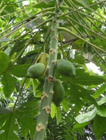 Latin name : Carica = eftoneously thought to have come from catica – karikos – a province in Asia minor; papaya popai, The papaw belongs to the family Caricaceae. It is classified as Carica papaya. The tree that is called papaw in the United States belongs to the family Annonaceae and is classified as Asimina triloba.Recently it is using in dengue patients to increase platlet count.It originated from Brazil, it has fewer sanskrit names